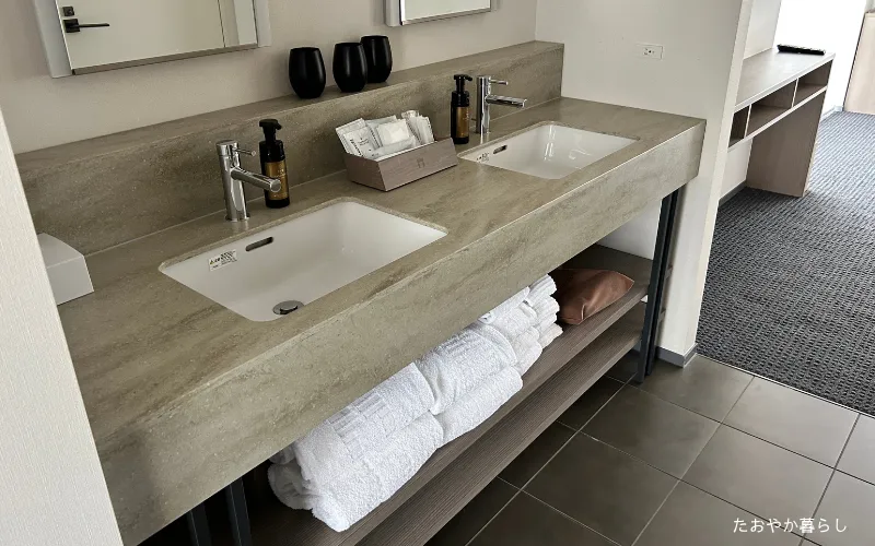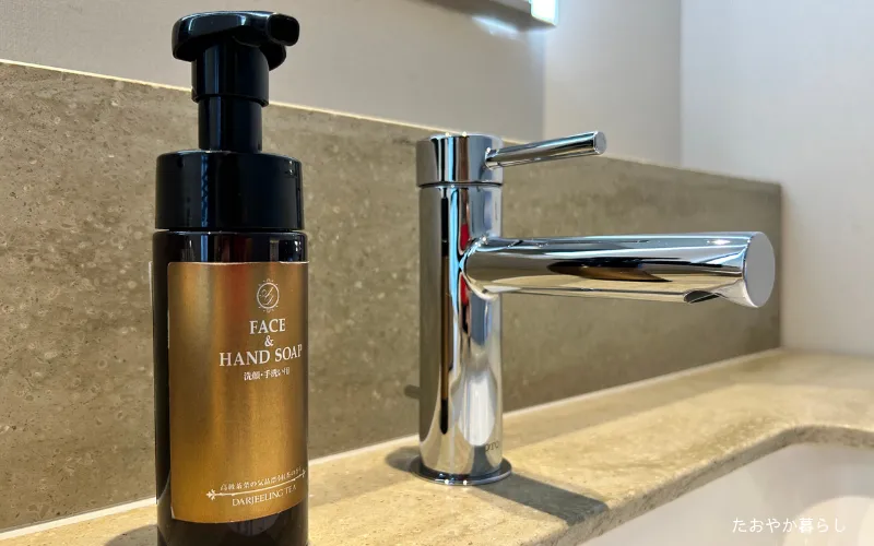 アメニティは部屋にひととおり揃っていて、自然派コスメブランドゼミドのフェイス&ハンドソープが使われていました。香りも強すぎず、ホテル全体の雰囲気と合っています。