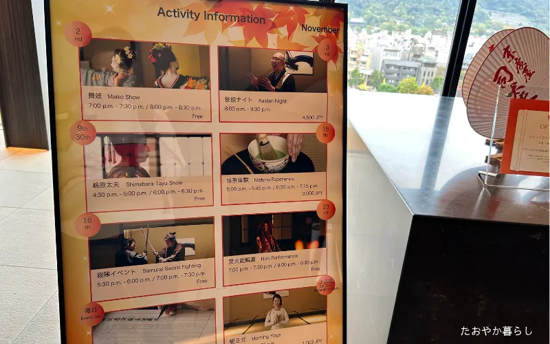 外は人通りも多くにぎやかなのに、館内はかなり落ち着いていて、音も照明も過剰ではありません。家族で泊まっていても不思議とせわしなさが薄く、心地よい場所のようになっている感じがありました。
