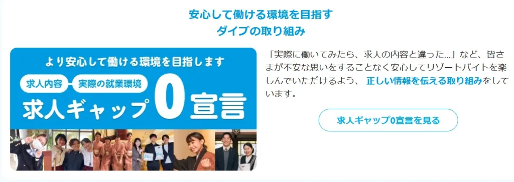 リゾートバイトダイブは、求人数・口コミ数・サポート体制の3つがそろった業界トップクラスのサービスです。
